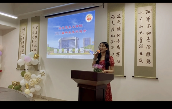 导师代表寄语环节,肖香龙老师的致辞情真意切,她希望各位毕业生不忘初心、方得始终,与人为善、真诚待人,成为有德有才,生活幸福的人。员工代表王珏海用激情洋溢的发言表达了对学长学姐的美好祝愿。2021届全体毕业生轮流讲述了对老师及同学的感谢和祝福。随后,严昭华、李洪周同学分别为大家演唱歌曲《送别》、《一荤一素》,使得欢送会现场倍感温馨。