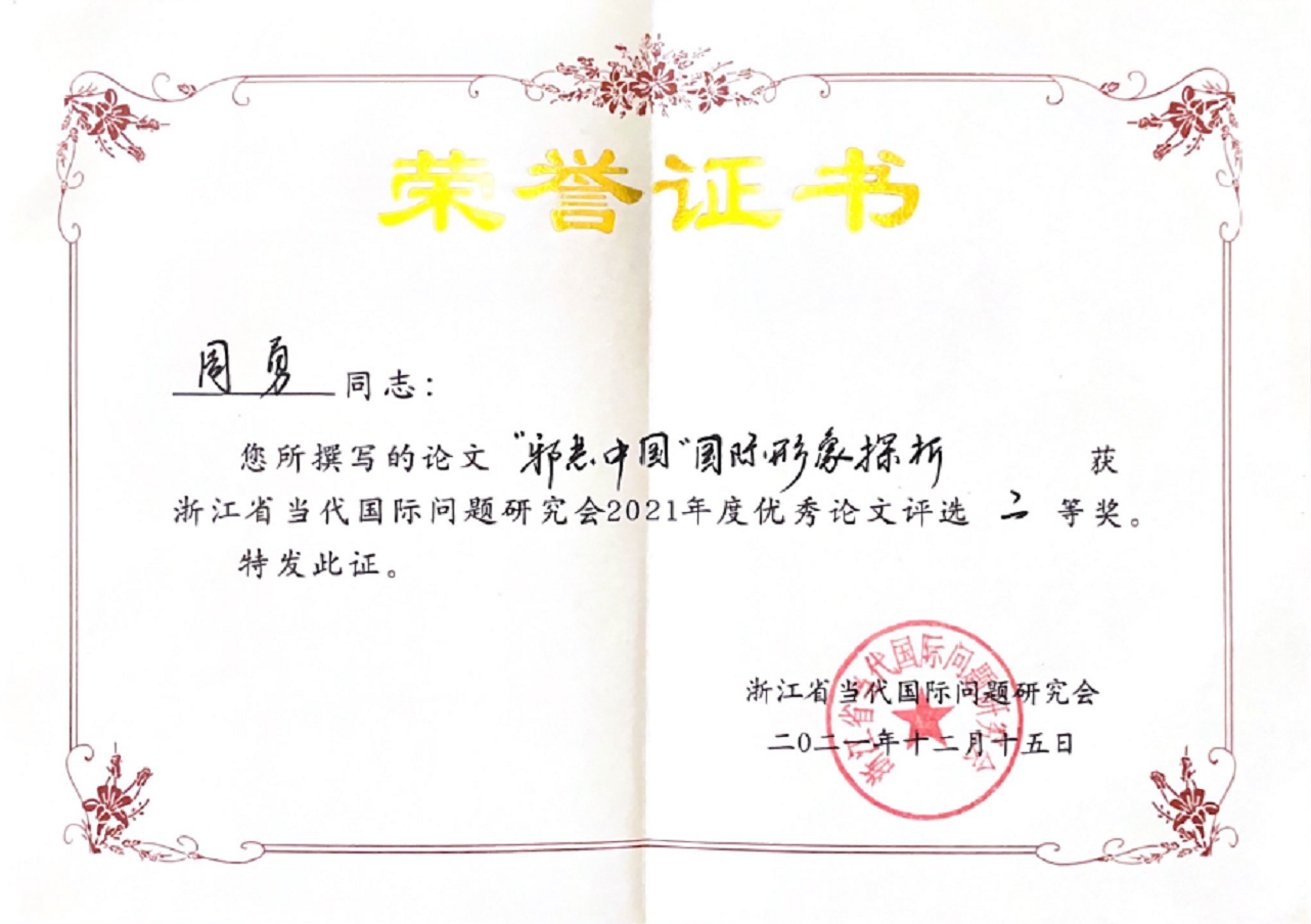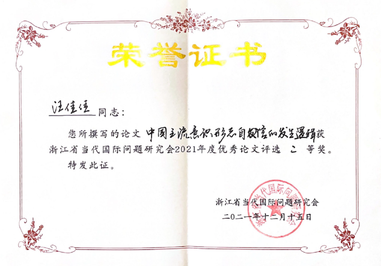 作为浙江省当代国际问题研究会的理事成员,公司王继全教授就乌克兰局势问题发表了看法,周勇博士做了关于“美国亚太安全战略的变化、影响和我国对策”的主题发言。周勇和汪佳佳的论文《“邪恶中国”国家形象探析》〉、《中国主流意识形态自信的发生学逻辑》均获得了2021年度研究会优秀论文二等奖。